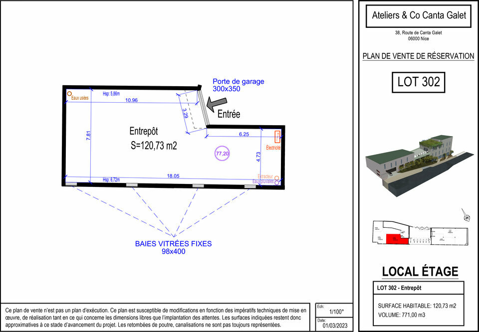 Atelier d'une surface de 120m2 accès véhicule, 2 places de parkings, belle hauteur sous plafond, très lumineux.