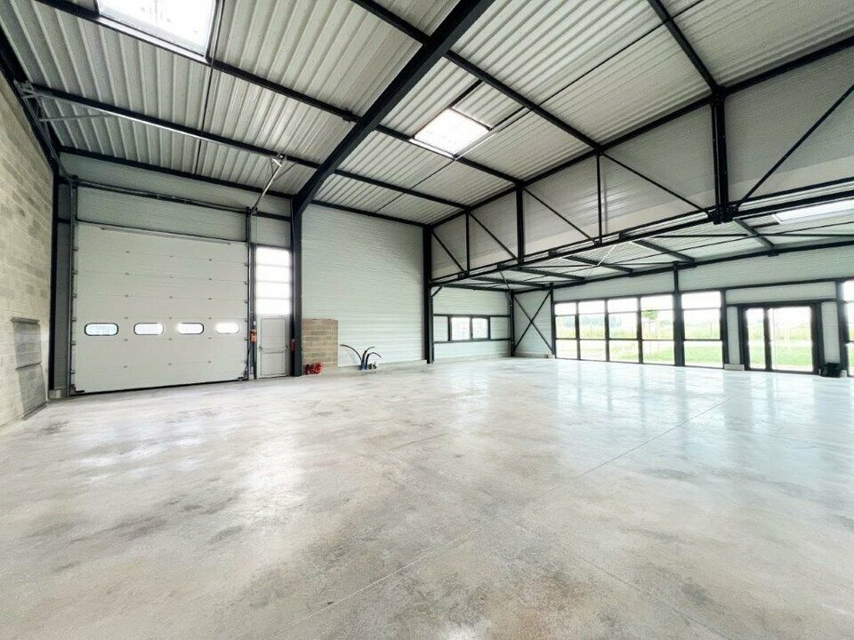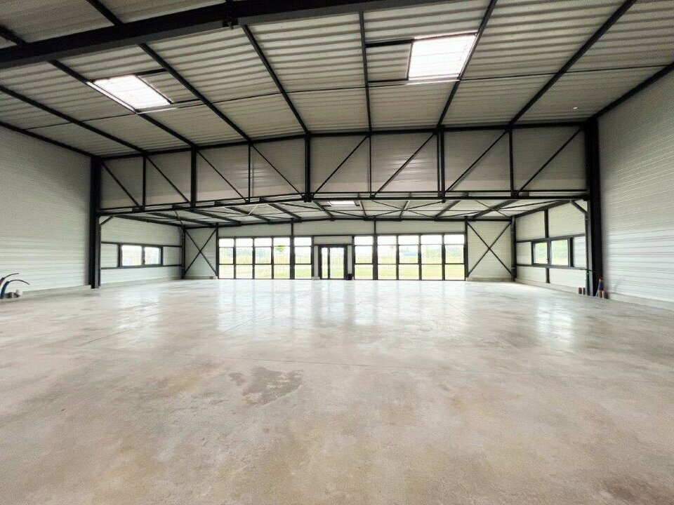 Le bâtiment, livré brut de béton avec fluides en attente, dispose de deux portes sectionnelles motorisées, de deux accès piétons dont une façade entièrement vitrée, idéale pour l'aménagement de bureaux ou d'un espace d'exposition.