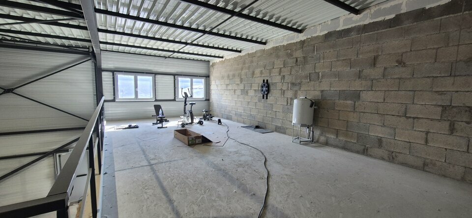 Une mezzanine complète l'ensemble, offrant une flexibilité supplémentaire, idéale pour l'aménagement de bureaux ou de stockage.