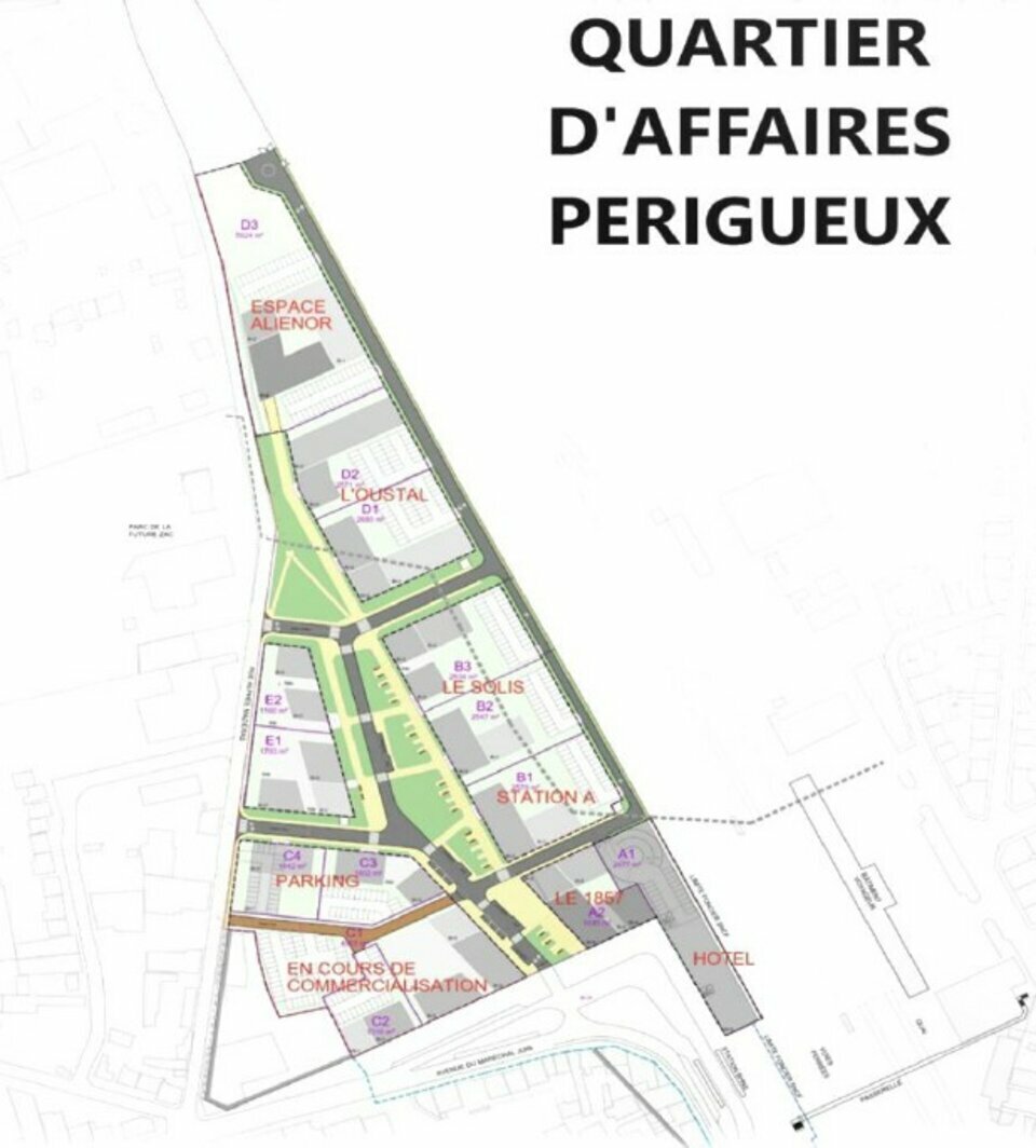 Au sein du nouveau QUARTIER D'AFFAIRES de Périgueux, pôle économique jouxtant la gare et à 10 minutes à pied du Quartier Médiéval et du centre ville, ATP IMMOBILIER vous propose à la location ou à la vente un local commercial neuf, brut de béton, fluides en attente, d'une surface de 478 m² divisible en deux locaux de 196 m² et 282 m², incluant 11 places de stationnement privatives.