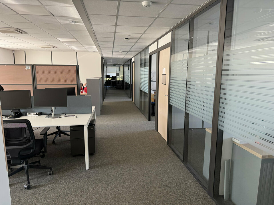 Les bureaux proposés à la location développent une surface totale d'environ 892 m², répartie sur plusieurs plateaux fonctionnels. Les locaux comprennent une salle de réunion, des bureaux cloisonnés, un espace cuisine et des sanitaires privatifs. L'ensemble est accessible aux personnes à mobilité réduite et bénéficie d'un bon niveau de confort.