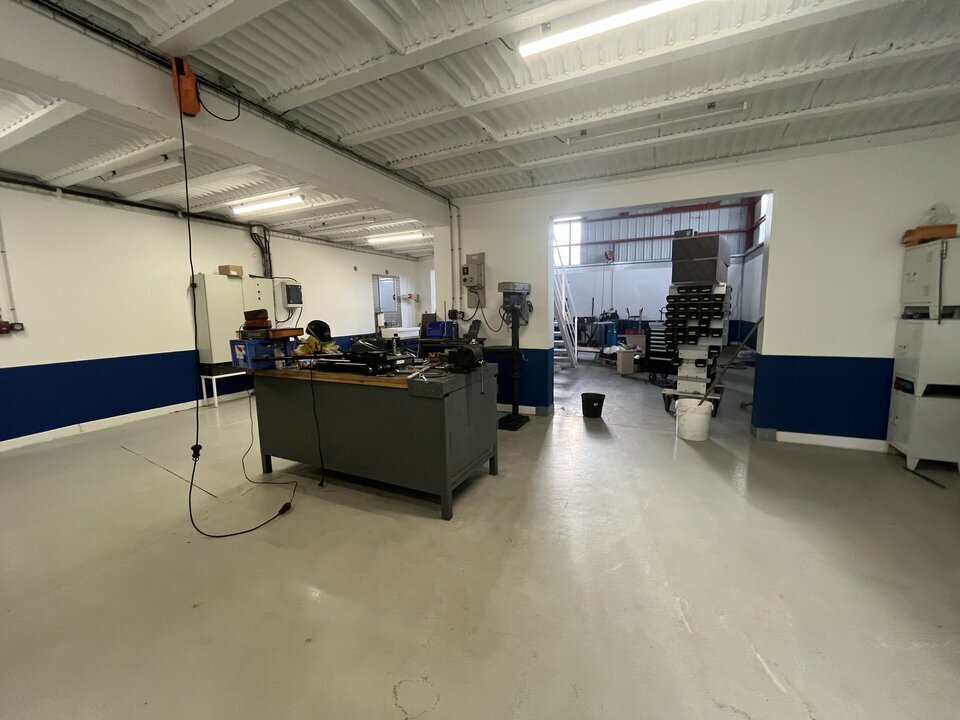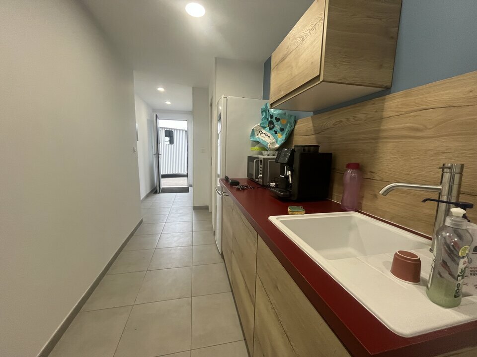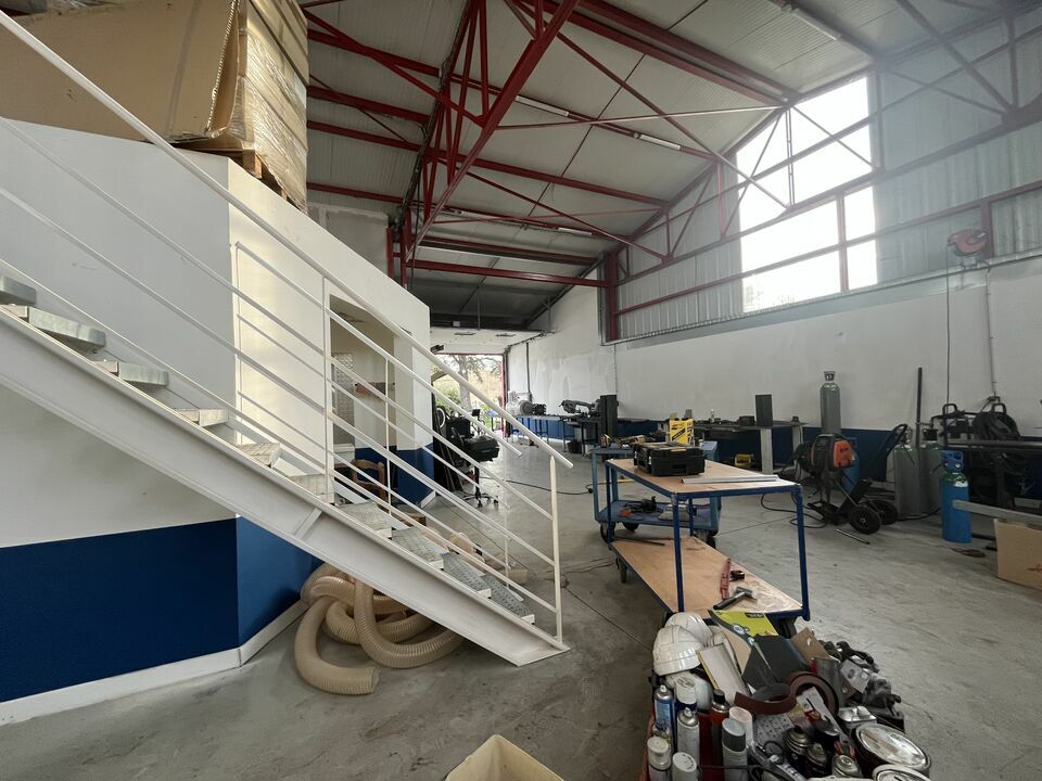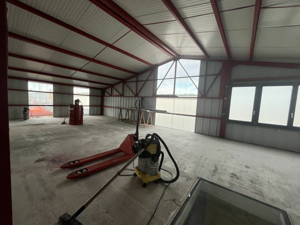 la zone atelier se décompose en 3 zones accessibles par deux portes sectionnelles, une mezzanine complète cette zone (possibilité de créer une autre zone bureaux avec espace d'aisance).