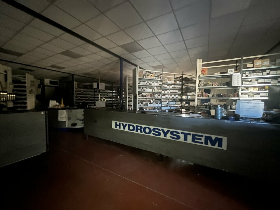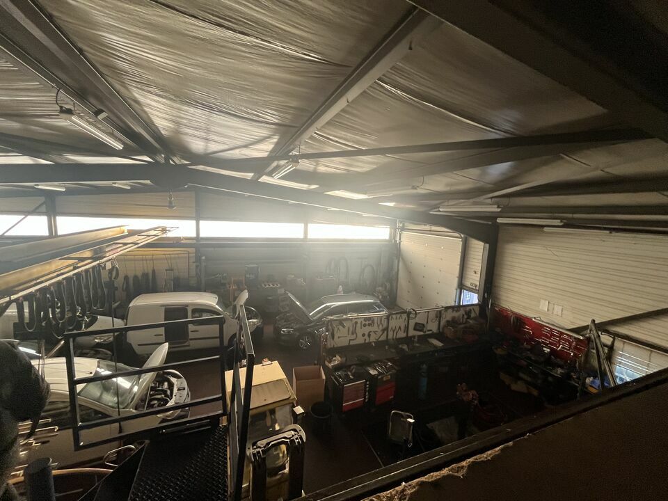 Un atelier de 300 m² avec porte sectionnelle 4 × 5 m, pont roulant 2 tonnes, récupérateur d'hydrocarbures, toilettes et douche, mezzanine de 250 m² environ complète la partie atelier.