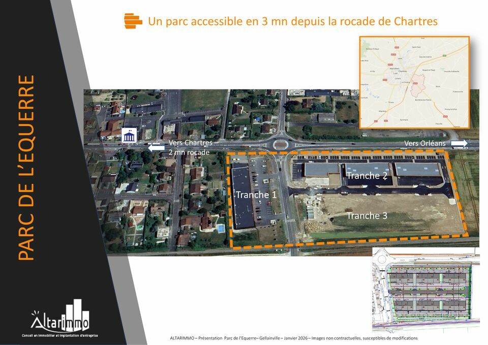 A VENDRE, LOCAUX D'ACTIVITÉS NEUFS au sein d'un parc qualitatif de locaux professionnels, destinés à des activités ARTISANALES, et de SERVICES. Les locaux sont divisibles sur-mesure, à partir de 240 m², dans un immeuble de plain pied. Le programme bénéficie d'une excellente visibilité, en façade de la RN154 (14 000 véhicules par jour), au sein d'un parc fonctionnel et à l'architecture originale.