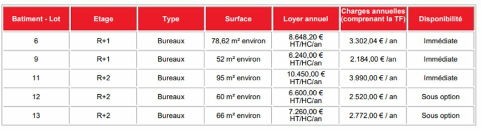 | 6 | R+1 | Bureaux | 78,62 m² environ | 8.648,20 Euros HT/HC/an | 3.302,04 Euros / an | Immédiate |