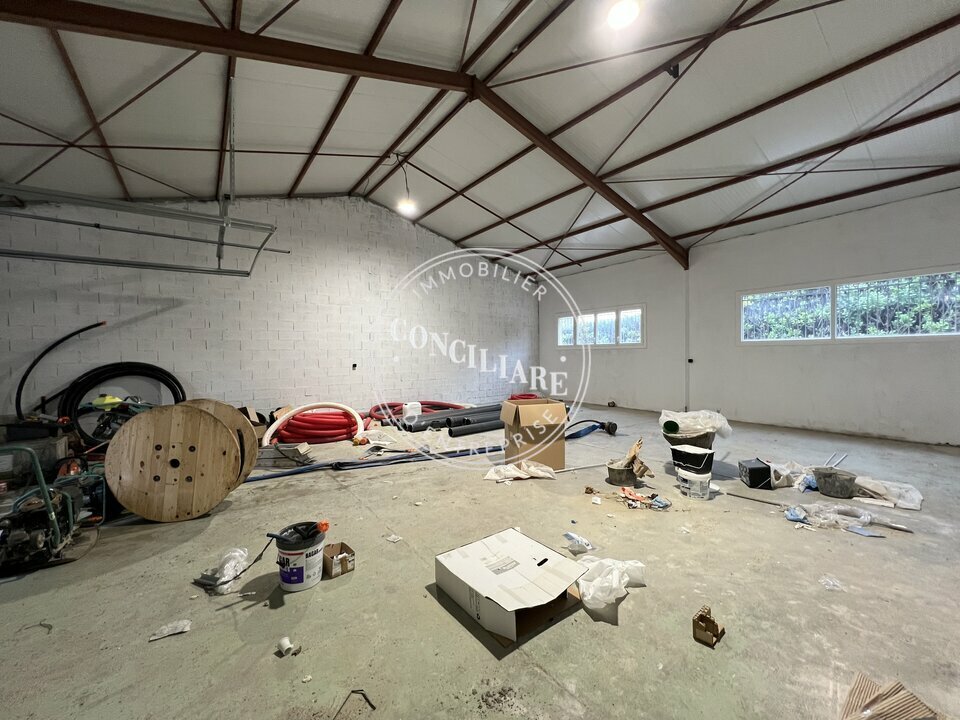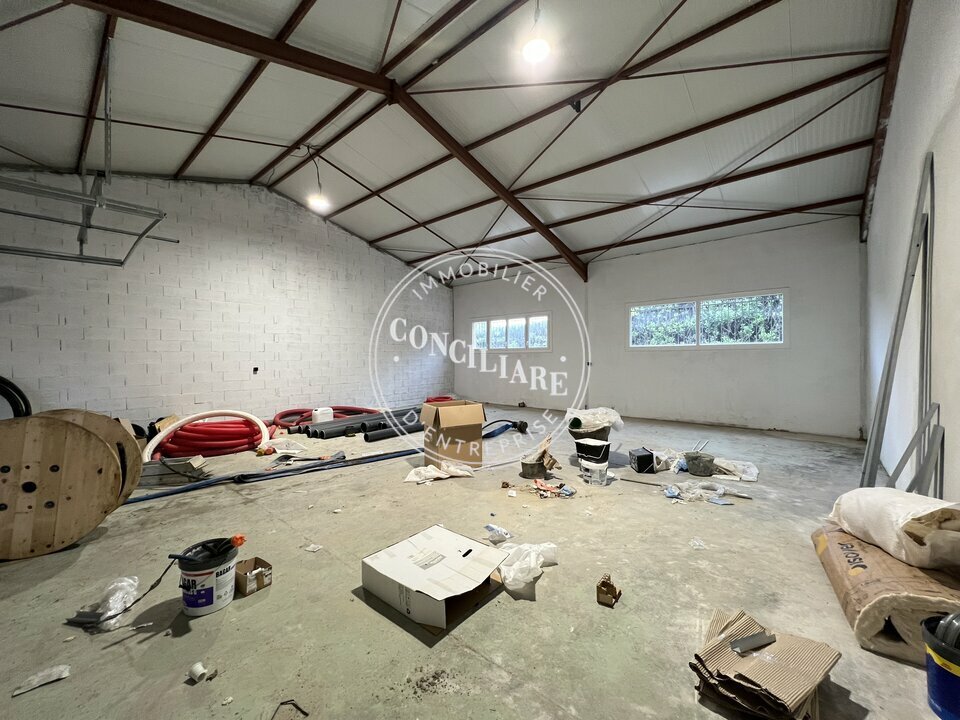 Une partie RDC de 125m2 avec accès par porte piéton, porte sectionnelle, sanitaires avec lave main.