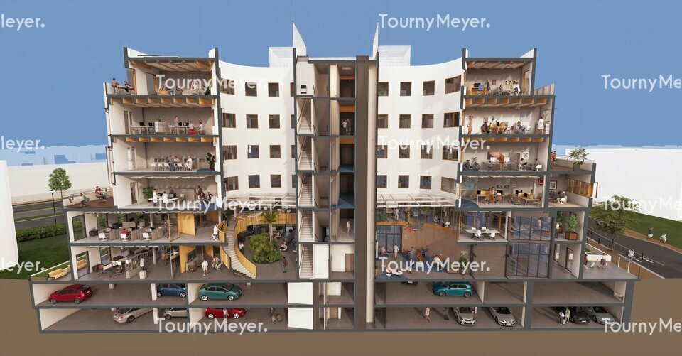 L'immeuble se développera sur 5 étages complétés par 2 niveaux de sous-sol, permettant d'intégrer des services adaptés aux besoins actuels des entreprises et des usagers.