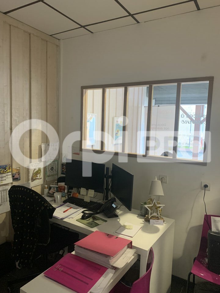 Grand hall d'accueil , 1 bureau cloisonné , 1 espace stockage archives et cuisine , sanitaire, lave main.