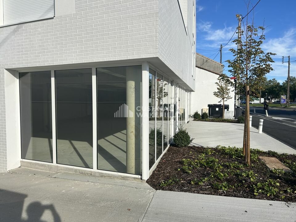 Un local commercial d'une surface de 213 m² neuf à réserver, livré brut de béton avec fluides en attente, menuiseries et vitrines posées.