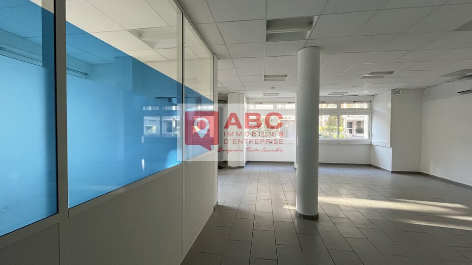 En RDC, en angle de rue avec beau linéaire vitré donnant sur avenue passante, bureaux commerciaux prêts à l'emploi d'une surface totale d'environ 140 m², accompagnés d'une cave en sous-sol d'environ 10 m²