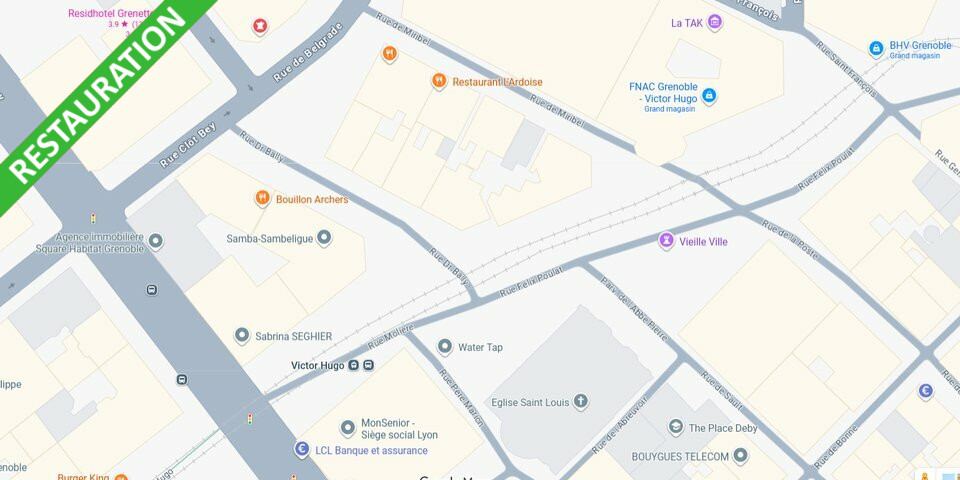 À céder : fonds de commerce de restauration idéalement situé à proximité de la place Victor Hugo à Grenoble, bénéficiant d'un passage voitures et piétons.