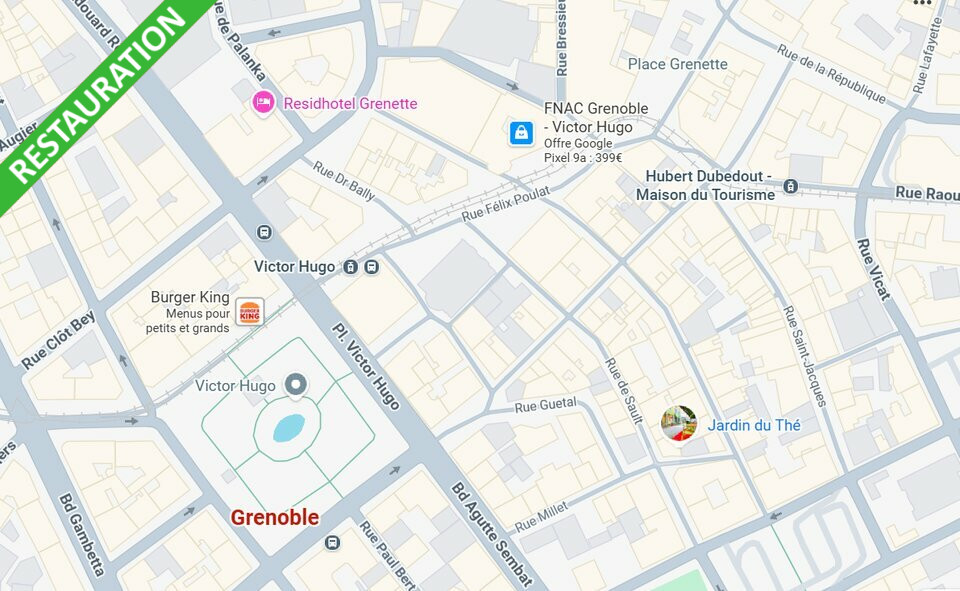 À vendre, fonds de commerce de restauration idéalement situé en hyper centre-ville, en zone entièrement piétonne très fréquentée, à quelques pas de la Place Victor-Hugo et de la Place Vaucanson.