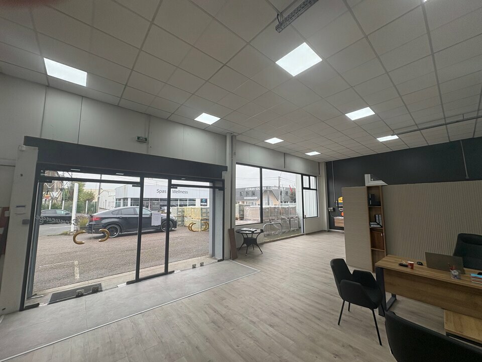 Ensemble commercial de 704 m² avec 20 mètres linéaires de façade et vitrines, deux portes vitrées avec rideaux métalliques électriques, parking en façade, accès livraison à l'arrière, à proximité directe des accès autoroutiers.