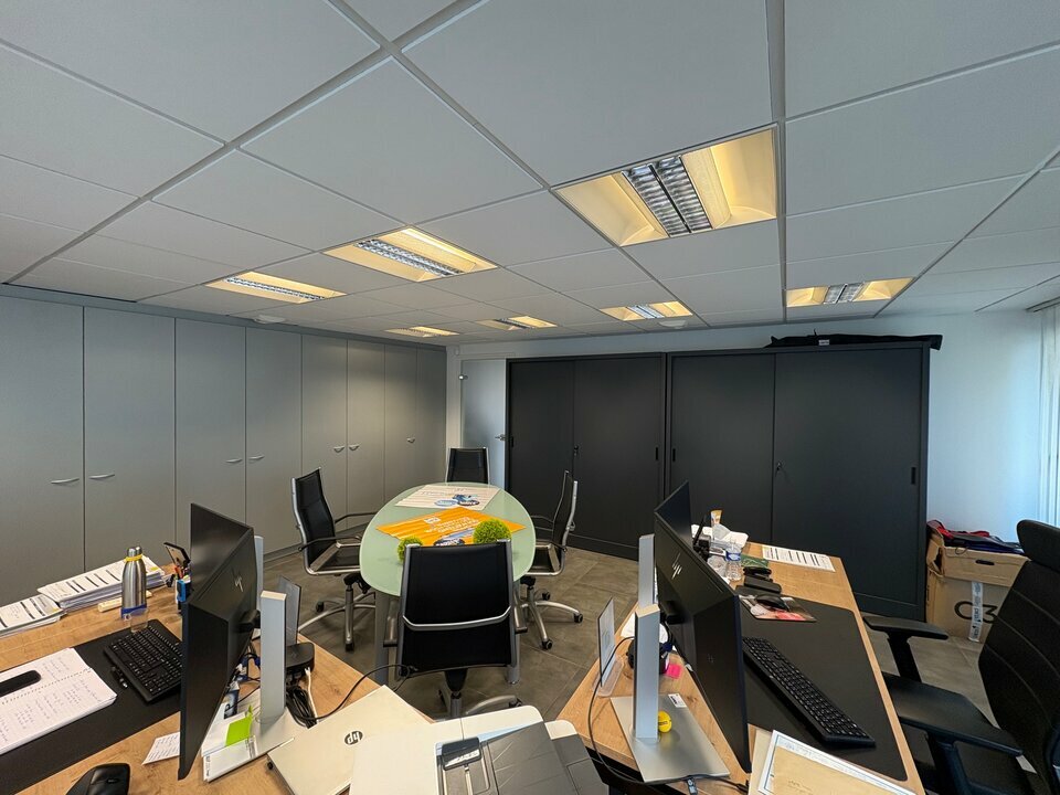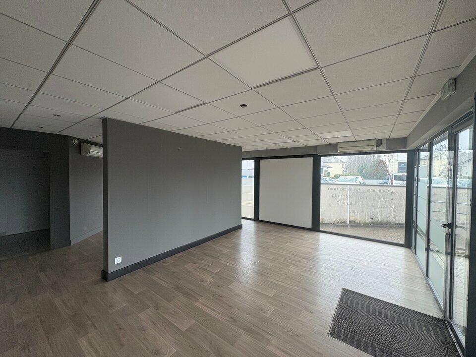 Cellule avec revêtement de sol stratifié et carrelage, climatisation réversible, vitrage sécurit, faux plafonds cadrettes avec luminaires, comprenant deux open spaces avec vitrines, 4bureau, trois sanitaires dont un aux normes PMR, et une kitchenette.