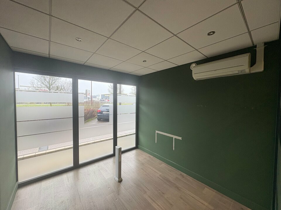 Cellule avec revêtement de sol stratifié, climatisation réversible, vitrage sécurit, faux plafonds cadrettes avec luminaires, comprenant deux espaces avec vitrines, un bureau, deux sanitaires dont un aux normes PMR, et une kitchenette.
