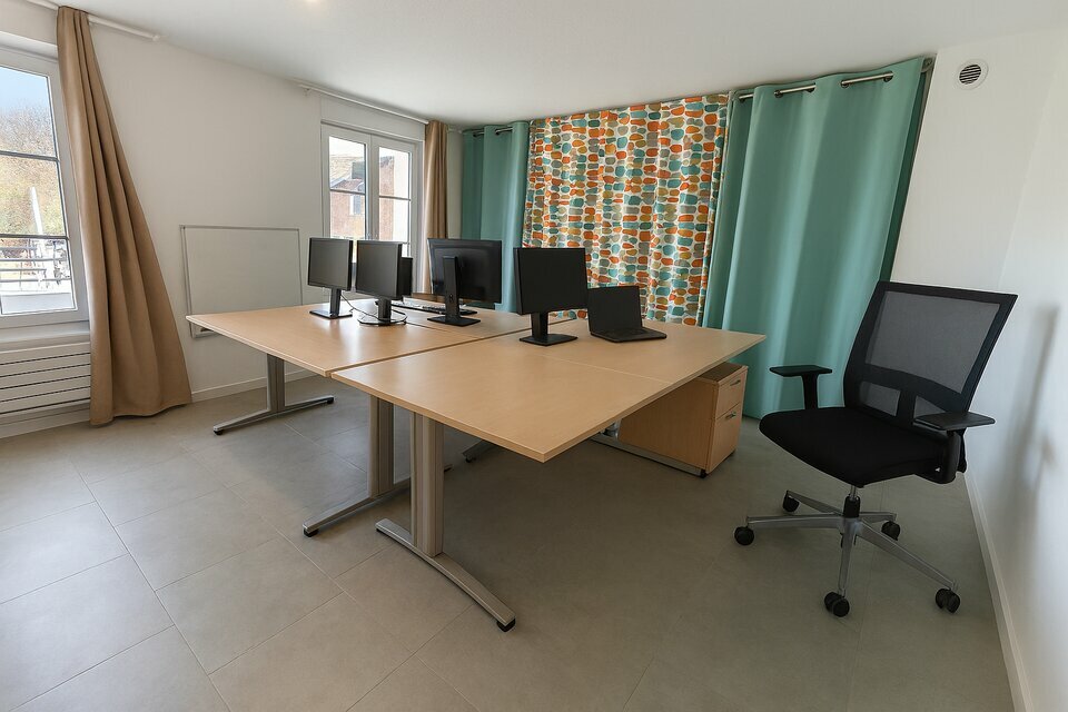 Les locaux comprennent une grande salle de réunion recloisonnable, 3 bureaux, un espace détente avec une cuisine, des WC PMR, un local ménage/archives.