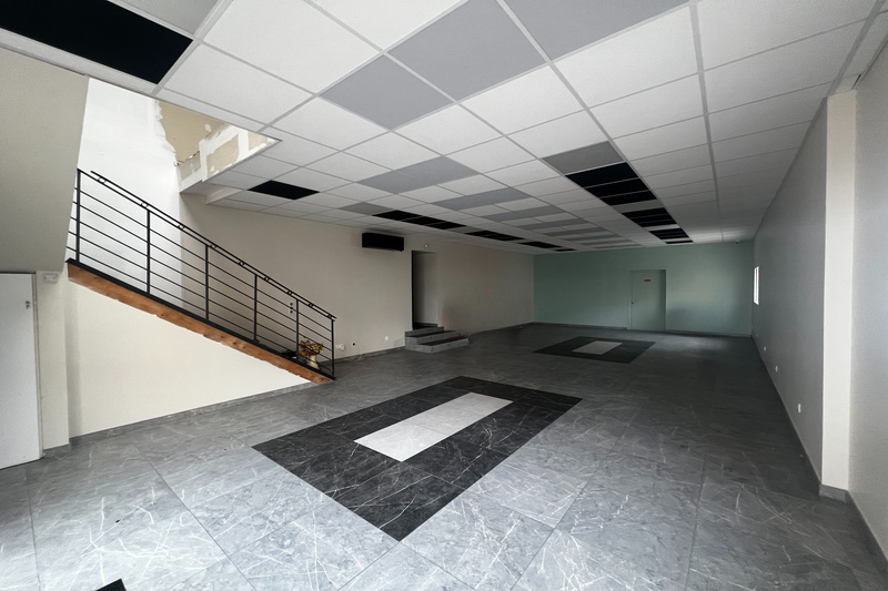 - Magasin showroom 80m² entièrement rénové faux plafond, dalles éclairantes, doublage périphérique, carrelage, climatisation, vitrines sur parking et rampe PMR, une mezzanine stockage archives 7.53m haut au total.