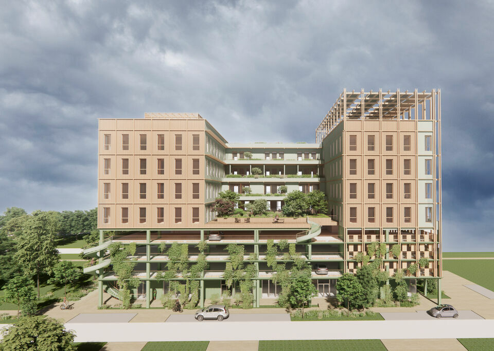 Structure bois, toiture végétalisée, brise-soleil, chauffage urbain, démarche de réemploi