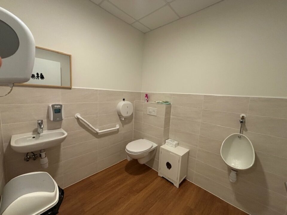 Accueil, bureaux/ sanitaires PMR au Rdc : 70 m2 un accueil et 3 bureaux cloisonnés