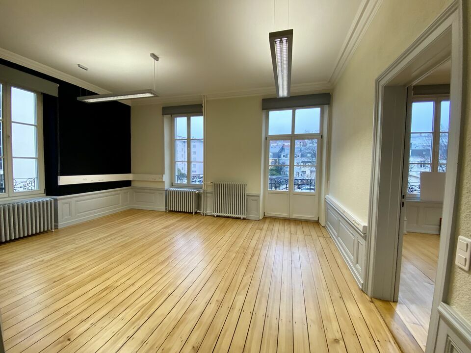 Quartier Sud à proximité immédiate de la gare et de la Cour d'Appel, une maison de maitre indépendante composée d'environ 200,10 m² de bureaux. Au rez-de-chaussée une entrée dessert trois bureaux de respectivement 11.7, 11.8 et 16.8 m², une cuisine et un sanitaire. Au premier étage, trois bureaux de 13.1, 23.9 et 16 m², un local de rangement comprenant la baie de brassage ainsi qu'une salle d'eau avec WC. Les combles ont été aménagé en un open-space / salle de réunion de 44.80 m², un bureau de 14 m² ainsi que deux sanitaires. Au sous-sol, la chaufferie et 55,30 m² de caves pouvant servir d'archives. A l'extérieur 10 places de parking et une dépendance pouvant servir de garage.