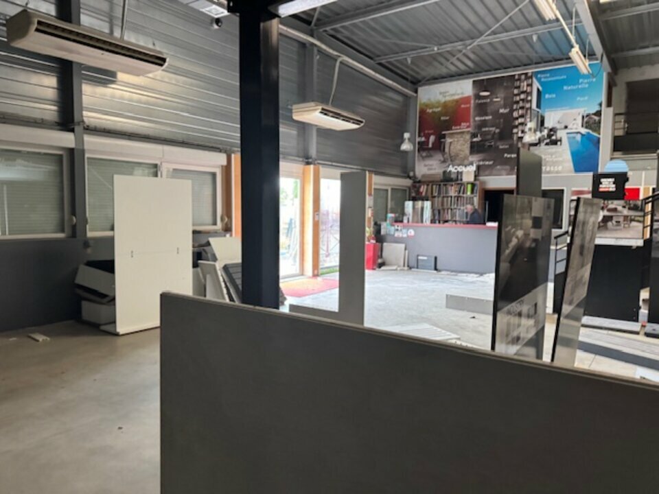 showroom avec porte vitrée double ouvrant, grande hauteur sur partie, local climatisé, comptoir de vente, bureaux, salle de réunion, cuisine,