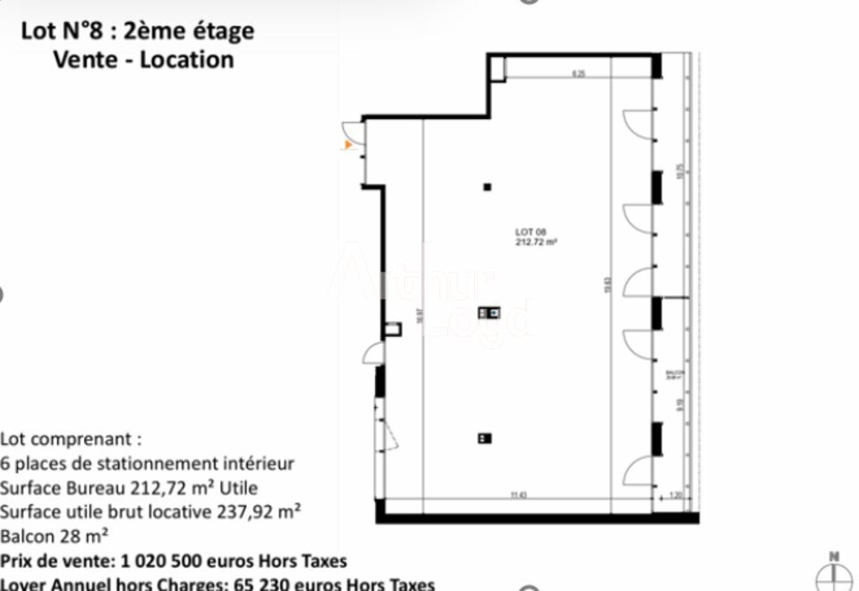 Plateau de bureaux situé une deuxième étage d'un immeuble neuf de standing d'une superficie de 212,72 m² ( surface pondérée 237,92m²).