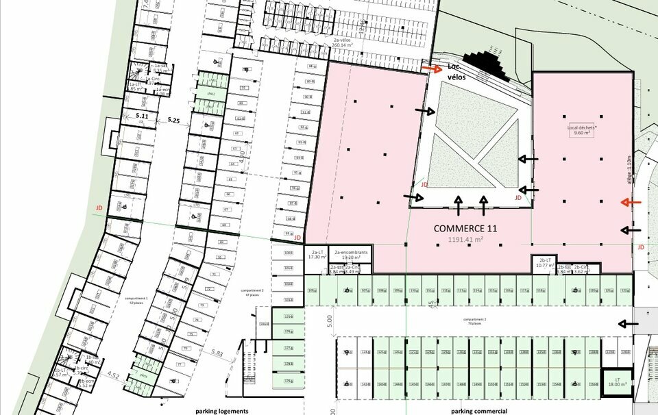 ⁻Un parking d'environ 70 places à usage de la clientèle commerce. Locaux commerciaux et professionnels disponibles à la location. Des espaces amples et des grandes ouvertures sur l'extérieur