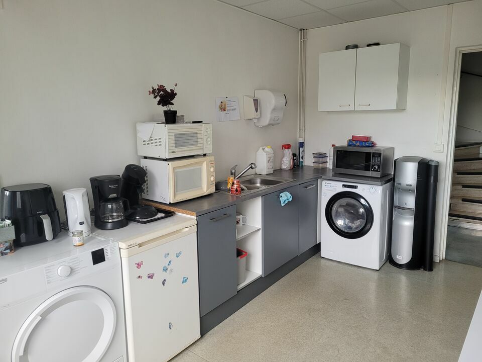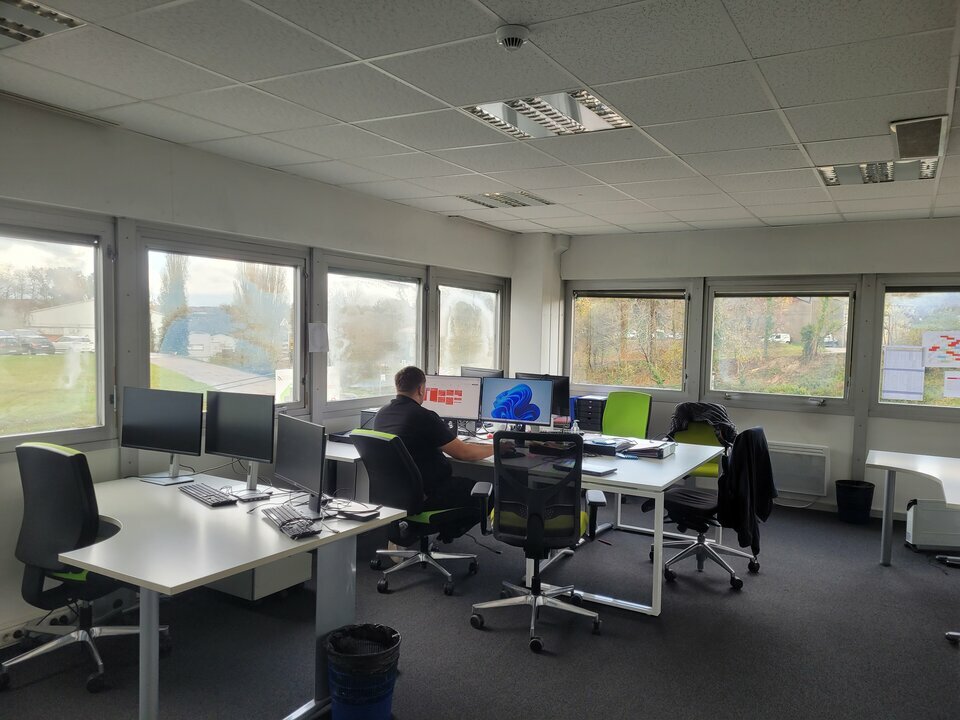 - une partie bureaux en R+1 (229 m² env.) : au rez-de-chaussée (76 m²), une entrée, un bureau, une salle de réunion et un réfectoire + à l'étage (153 m²), un pallier, 2 sanitaires, 4 bureaux et un grand espace à plusieurs postes de bureaux.