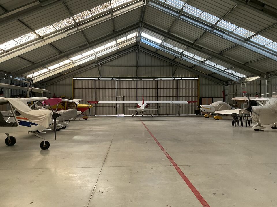 Découvrez ce hangar en acier galvanisé conçu pour le stockage et le stationnement d'aéronefs légers, ULM, voitures et motos de circuit. Il présente 3 travées de 20 à 22 m de large et 5 portes d'accès, permettant l'entrée simultanée de plusieurs aéronefs et une circulation aisée à l'intérieur du hangar.