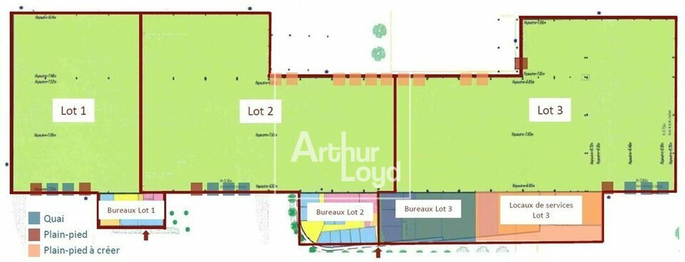 | Batiment - Lot | Quais et Plain Pied | Entrepôt | Bureaux | Surface totale | Loyer annuel HT/HC | Disponibilité |