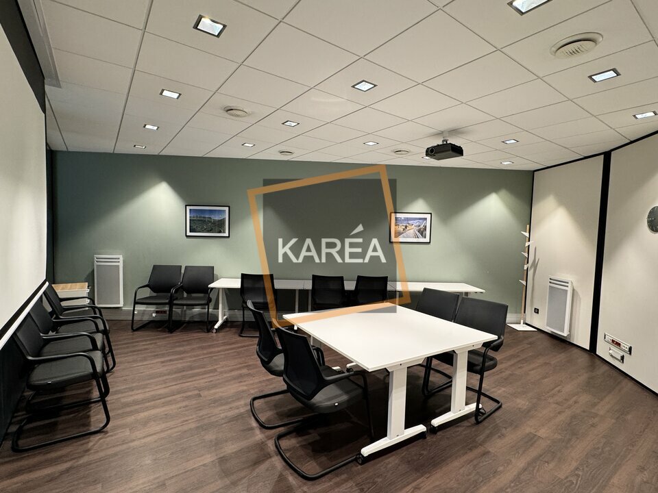 Local climatisé, aménagé avec cloisons vitrées, salle de réunion modulable, espace cuisine, le tout dans un environnement professionnel et fonctionnel.