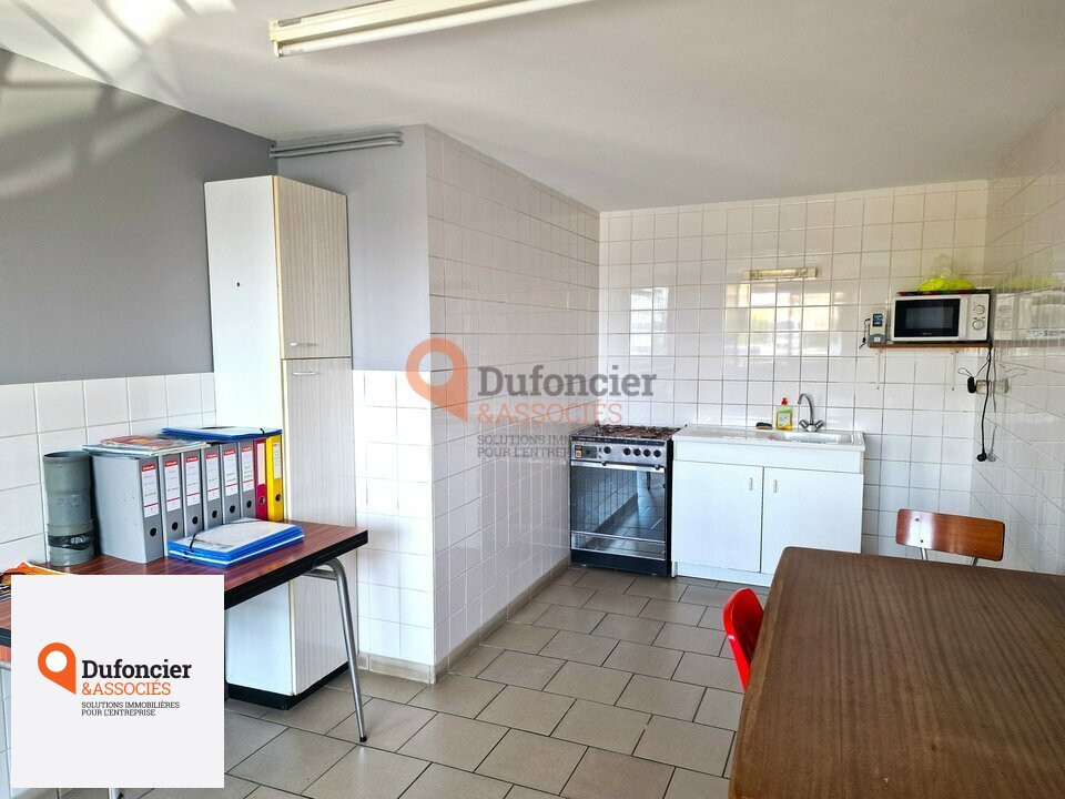 Bâtiment composé au rez de chaussée de deux ateliers ou stockage avec deux fosses pour entretien des véhicules utilitaires et poids lourds dont une comblée, une pièce de stockage (magasin), réfectoire, sanitaires et vestiaires.
