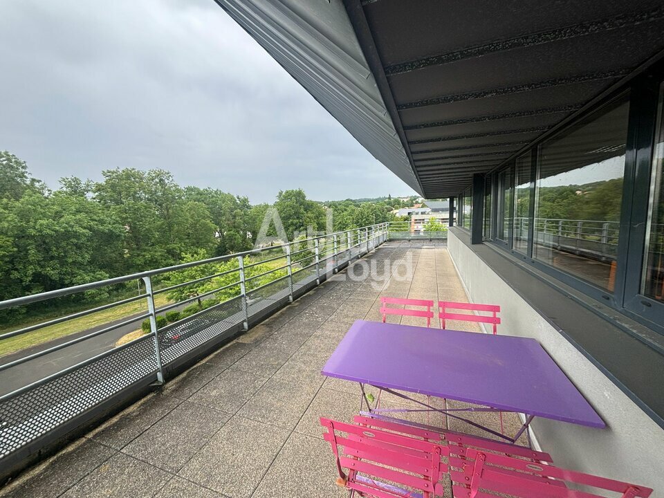 À l'étage supérieur : une grande salle de pause de 42 m² avec accès à un vaste balcon de 70 m², deux toilettes supplémentaires, une salle de réunion de 33 m², deux petits bureaux (env. 7 m²) et un open space.
