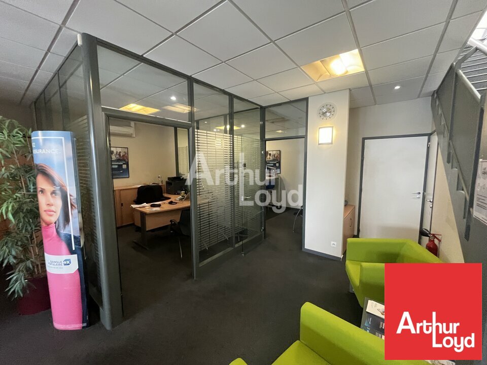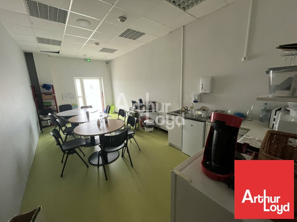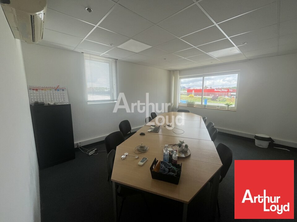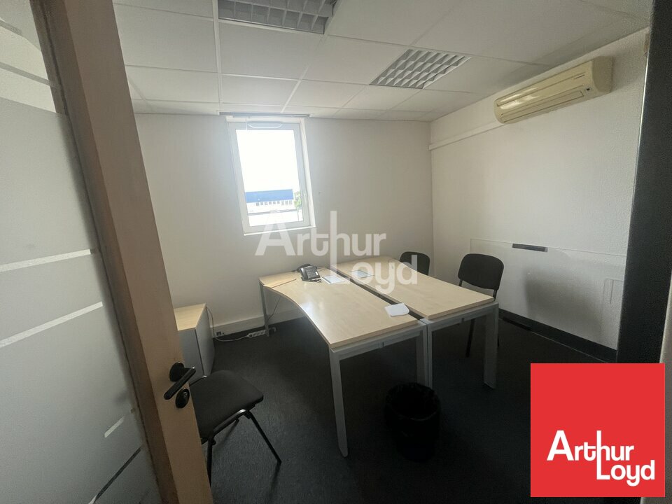 Les bureaux sont aménagés, climatisés et câblés (RJ45, baie de brassage). RDC : 200 m² avec bureaux fermés, salle de repos, accueil, sanitaires. R+1 : 340 m² comprenant 10 bureaux, salle de réunion, cafétéria, sanitaires. Cloisonnement modulaire.