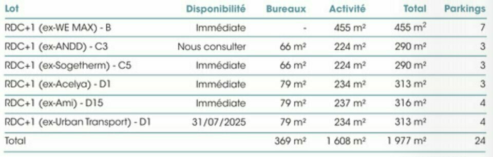 | Batiment - Lot | Etage | Type | Surface | Loyer annuel | Parkings | Disponibilité |