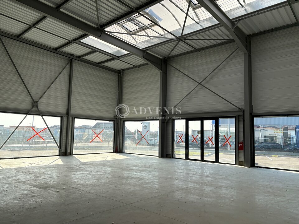 Ce hall bénéficie d'une grande vitrine à l'avant pour un showroom, avec entrée par une porte double battant. A l'arrière une porte sectionnelle électrique de 4x3,5 m ainsi qu'une porte piétonne. Ainsi qu'une mezzanine de 70 m² non accessible à ce jour. Livré brut, fluides en attente.