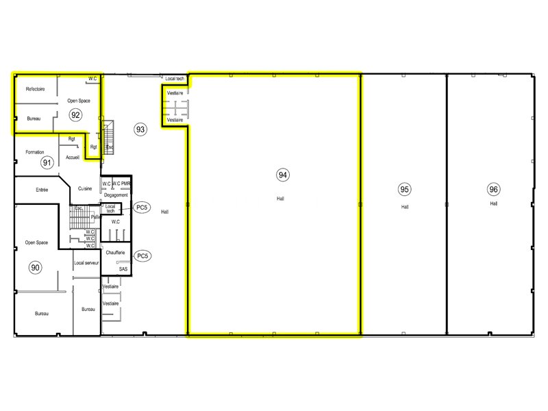 Ces locaux sont composés de 102 m² de bureaux avec 2 entrées indépendantes et aménagés en un open-space, un réfectoire, un grand bureau cloisonné, un local d'archive et un sanitaire privatif. Et d'un hall, non accessible depuis les bureaux, de 865 m² avec 3 portes sectionnelles.